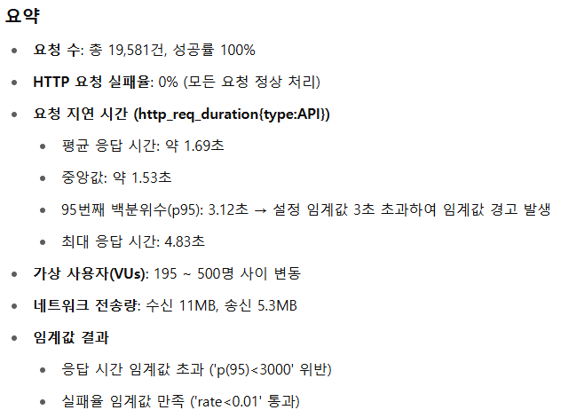 | 95백분위 응답 시간(p95) | 5.59초 | 3.12초 | 목표 3초 근접, 경고 발생 |